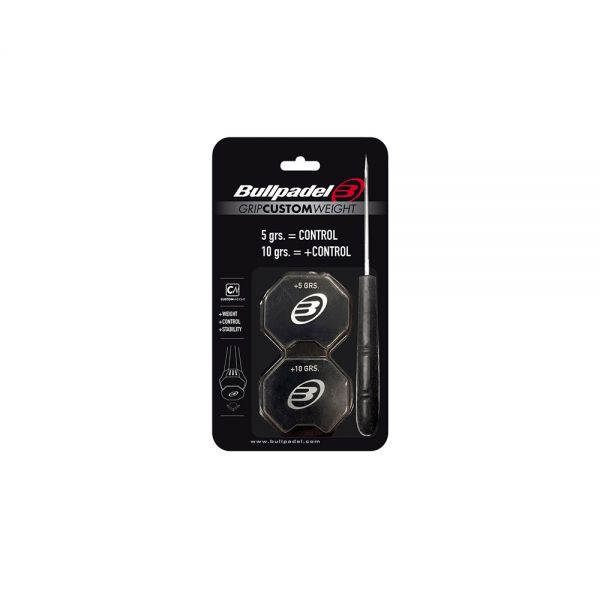Confezione da 2 unità di tappi per il fondo del manico da 5 grammi e da 10 grammi per poter cambiare il bilanciamento della tua racchetta Bullpadel. Include inoltre lo strumento per poter togliere i tappi con maggio facilità.